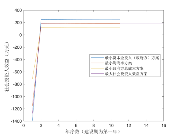 风险偏好假设。为更加符合政策要求以及贴合实际经验,在各案例贷款利率不变的前提下,假设还贷期与运营期保持一致,各项目运营期不低于10年。同时,设定社会投资人的风险偏好为时间风险厌恶型,即更倾向于较快回本而不是一味地追求回报总额。