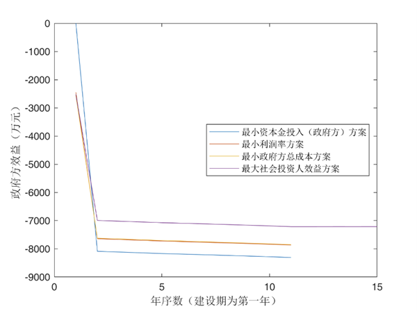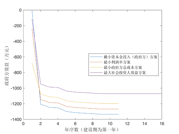 从200个生成的优化方案中,选择政府方最小资本金投入比例(股权)、最小合理回报率(利润率)方案,政府方最小总成本方案以及社会投资人最大效益方案进行比选分析。