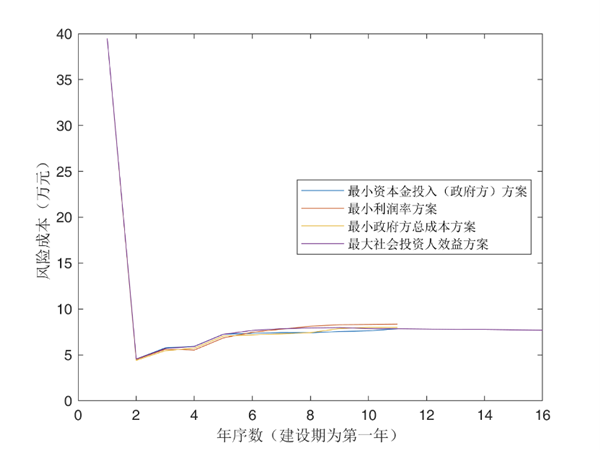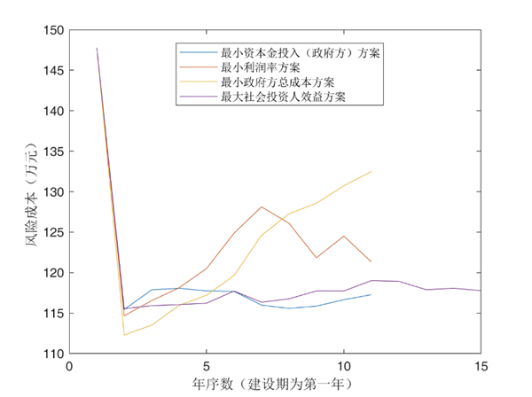 整体上看,该项目风险成本资金流在各方案间区别较小。对社会投资人而言,最小合理回报率(利润率)方案与最大社会投资人效益方案在运营期的资金流水平相近,最小政府方资本金投入方案在运营期的资金流入水平较高,有助于社会投资人加快回收成本。对于政府方而言,最大社会投资人效益方案在运营期的支付水平最低,同时比最小政府总成本方案在建设期的投入要少。