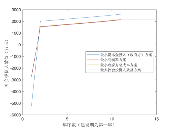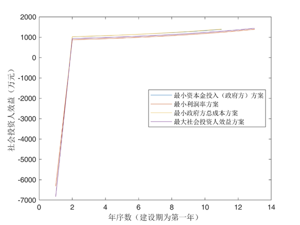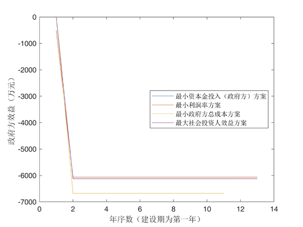 综合上述结果来看,优化方案给出的结果均为社会投资人“保本”策略(收益率接近于零),能够为政府方决策者给予“拧干”后的项目投资数据。因而,为客观地反映优化效果,在以项目原方案数据进行比较时,将社会投资人财务基准收益率统一设置为一个非常小的值,例如0.0001,用作社会投资人计算其效益现值的折现率。当其现值大于零,意味着社会投资人参与该项目能够收回成本,不至亏损。